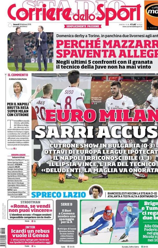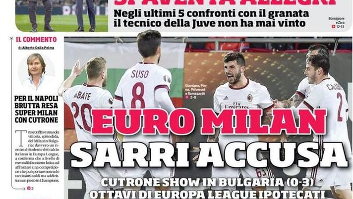 La prima pagina del Corriere dello Sport in edicola oggi mette il centro le partite di Europa League. Si parla quindi dl Milan di Gattuso che ha vinto in trasferta in Bulgaria, contro il Ludogorets, tre a zero e il Napoli di Sarri che invece ha perso in casa. "Euro Milan. Sarri accusa. Cutrone show in Bulgaria, ottavi di Europa League ipotecati. Il Napoli irriconoscibile (1-3). Il Lipsia vince e il tecnico si dice deluso: "La maglia va onorata".