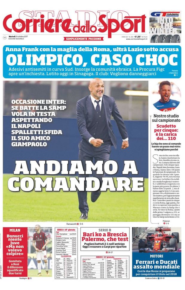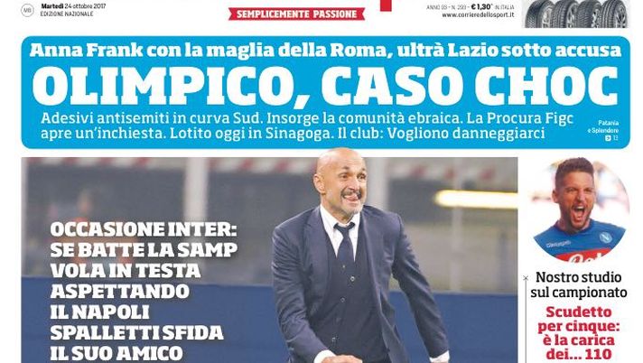 E' il giorno di Inter-Sampdoria e il Corriere dello Sport parla di "Occasione Inter, se batte la Samp vola in testa aspettando il Napoli. Spalletti sfida il suo amico Giampaolo". Il titolo centrale dedicato ai nerazzurri è "Andiamo a comandare". Poi di spalla c'è uno studio del CdS: "Scudetto per cinque e la carica dei 110. Le big che sono al comando hanno un passo mai visto: vi spieghiamo perché". Nel taglio alto: Olimpico, caso choc. Anna Frank con la maglia della Roma, ultrà Lazio sotto accusa. Adesivi antisemiti in Curva Sud. Insorge la comunità ebraica. La Procura Figc apre un'inchiesta. Lotito oggi in Sinagoga. Il club: "Vogliono danneggiarci".