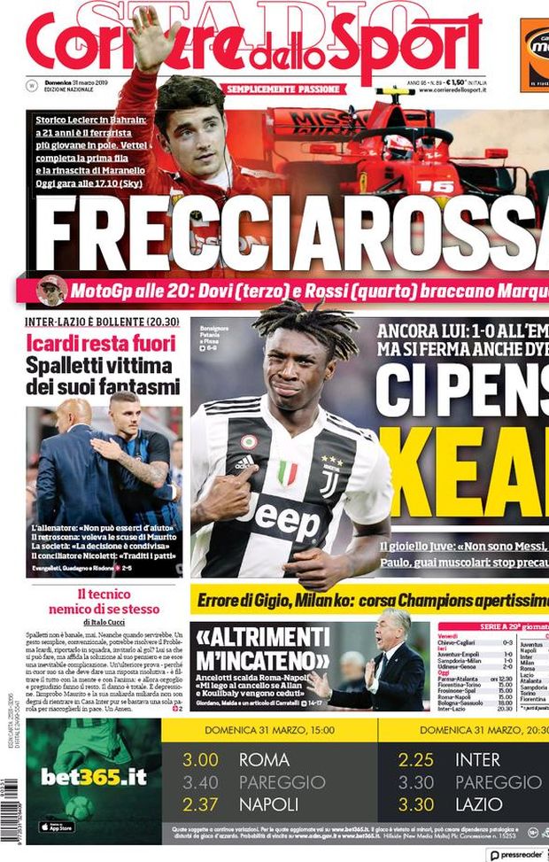 La prima pagina del Corriere dello Sport in edicola domenica 31 marzo 2019