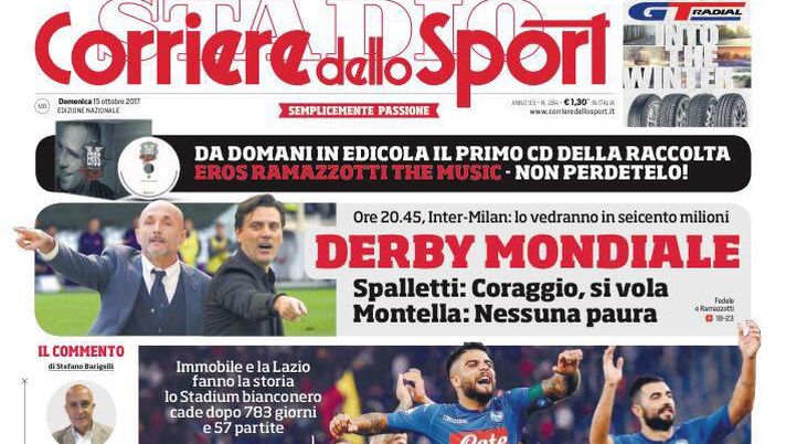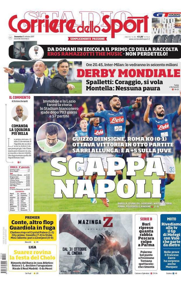 "Scappa Napoli". Il titolo principale del Corriere dello Sport è dedicato alla squadra di Sarri che battendo la Roma all'Olimpico, dopo la sconfitta della Juventus per mano della Lazio allo Juventus Stadium, vola a + 5 dai bianconeri ed è da sola al primo posto della classifica. "Guizzo di Insigne, Roma ko. Ottava vittoria in otto partite. Sarri allunga a più cinque sulla Juventus". Nel taglio alto invece si parla di Inter-Milan: "Derby mondiale, lo vedranno in seicento mln. Spalletti, coraggio si vola. Montella: nessuna paura".