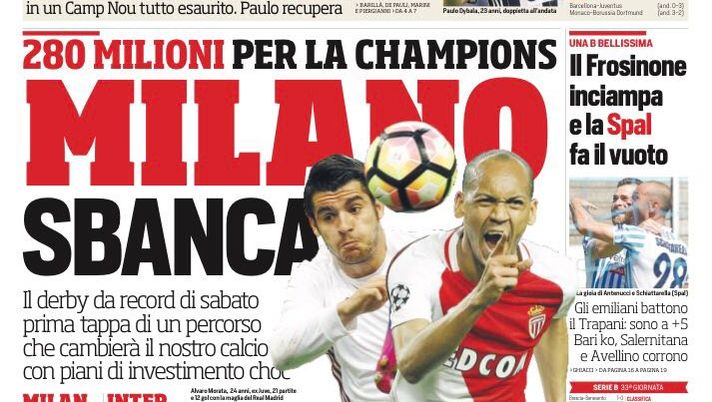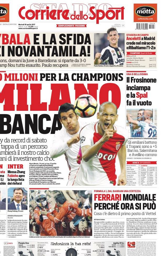 Il Corriere dello Sport in edicola martedì 18 aprile 2017 regala ampio spazio alla Milano cinese, pronta ad investire pesantemente nel mercato: "280 milioni per la Champions, Milano sbanca. Il derby da record di sabato prima tappa di un percorso che cambierà il nostro calcio con piani d'investimento choc". Sguardo all'Inter: "Mossa Zhang, Fabinho apre alla lunga lista di rinforzi. Indipendentemente da come finirà questa stagione, Suning non si aspettava che l'avventura al timone dell'Inter potesse iniziare con queste difficoltà. A dispetto di un investimento sul mercato da 140 milioni, i risultati finora sono stati deludenti". Spazio anche al Milan: "Anche Morata con Benzema nei piani di Li. C'è Musacchio".