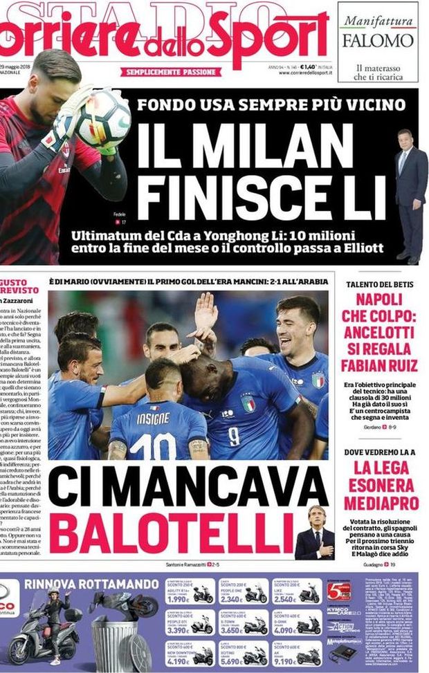 "Ci mancava Balotelli". Ivan Zazzaroni firma l'editoriale che dà il titolo al Corriere dello Sport in edicola oggi. Viene esaltato il gol dell'ex nerazzurro al ritorno in Nazionale che ha visto esordire pure l'altro ex interista, Roberto Mancini, sulla panchina azzurra come CT. Nel taglio alto si parla del Milan: "Finisce Li. Fondo Usa sempre più vicino. Ultimatum del CdA a Yonghong Li: 10 mln entro la fine del mese o il controllo passa ad Elliott". Mercato Napoli: "Ancelotti si regala Fabian Luiz".