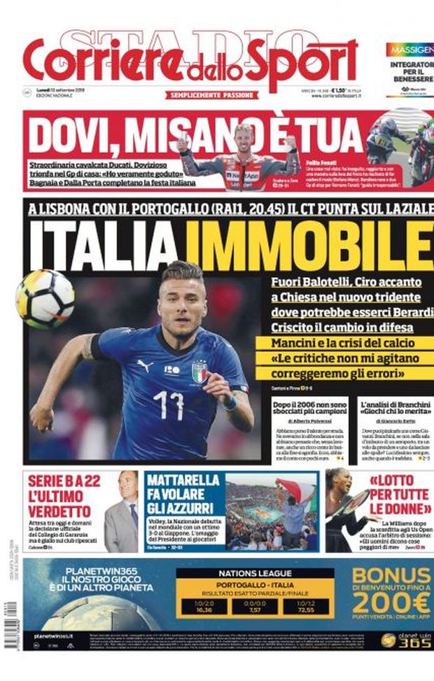 Il Corriere dello Sport dedica la sua prima pagina alla Nazionale e scrive: "Italia-Immobile. Fuori Balotelli, Ciro accanto a Chiesa nel nuovo tridente dove potrebbe esserci Berardi. Criscito il cambio in difesa". Si riportano in prima pagina anche le parole di Mancini pronunciate in conferenza stampa alla vigilia della partita con il Portogallo: "Le critiche non mi agitano, correggeremo gli errori".