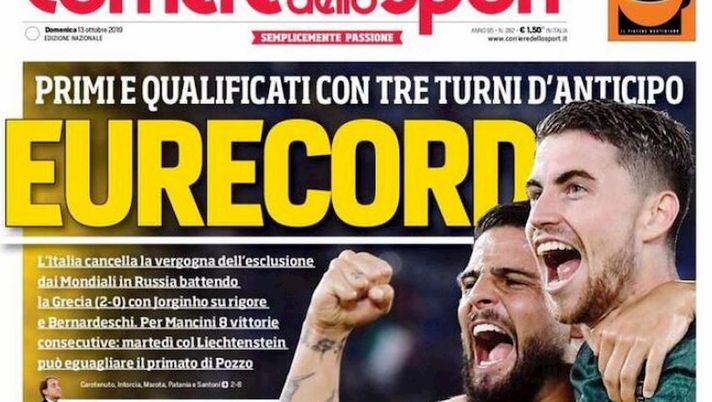 Dopo la vittoria per 2-0 della Nazionale e la qualificazione a Euro 2020, il titolo principale del Corriere dello Sport è dedicato proprio alla selezione di Mancini. Ecco il titolo dedicato all'ex allenatore dell'Inter: