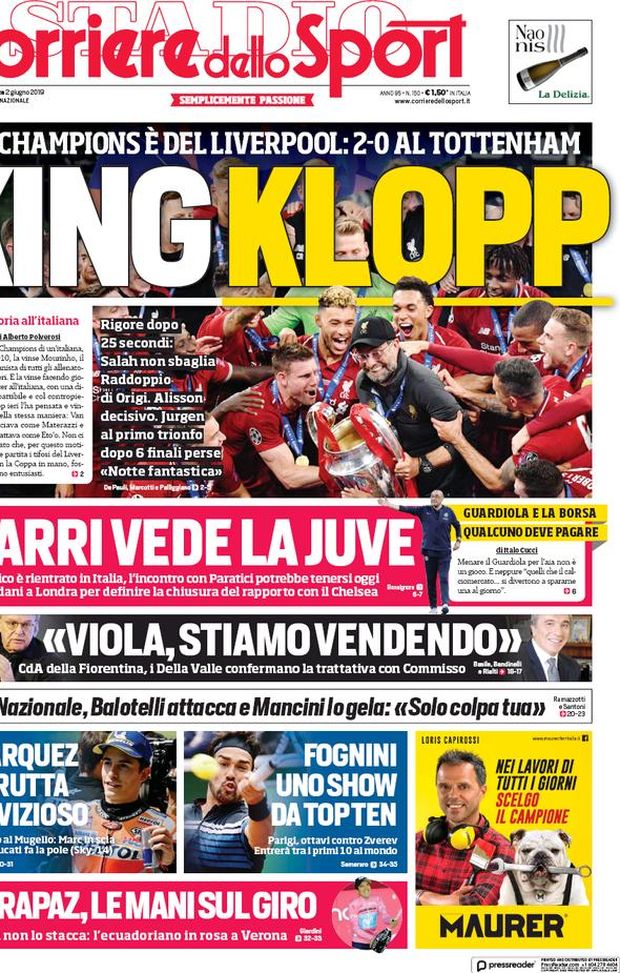 Il Corriere dello Sport in edicola oggi titola King Klopp e assegna a lui i meriti della Champions vinta dal Liverpool battendo 2-0 in finale il Tottenham che ai gironi aveva eliminato l'Inter di Spalletti. "Sarri vede la Juve" è l'altro titolo principale e c'è un editoriale di Italo Cucci intitolato: "Guardiola e la borsa, qualcuno deve pagare". Si parla anche di due ex Inter, Mancini e Balotelli: "Nazionale, Mancini attacca Balotelli e lo gela: «Solo colpa tua»".