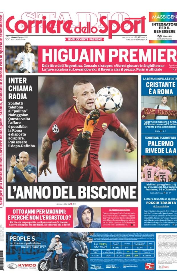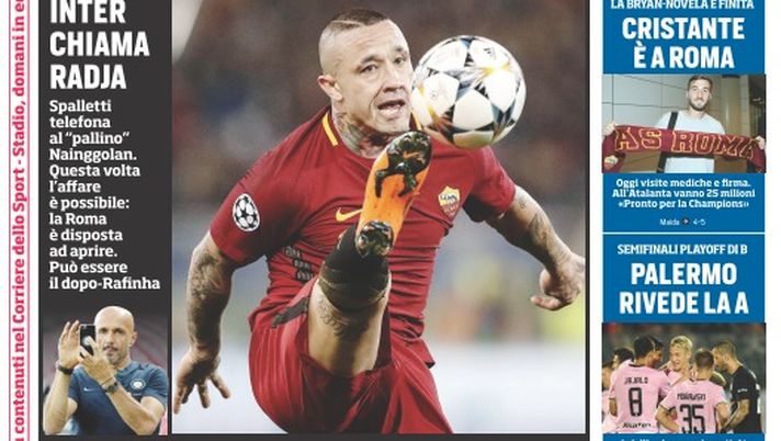 "L'anno del Biscione". Questo è il titolo principale del Corriere dello Sport che parla di una trattativa in particolare che riguarderebbe l'Inter che avrebbe contattato Radja Nainggolan: "Spalletti telefona al suo pallino. Questa volta l'affare è possibile: la Roma è disposta ad aprire e può essere il dopo-Rafinha". Taglio alto dedicato alle parole di Higuain che definisce la Premier una meta interessante. E spazio all'arrivo di Bryan Cristante a Roma: sarà giallorosso.