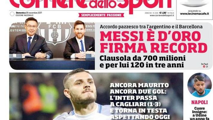 Mauro Icardi è il condottiero che ha portato l'Inter alla vittoria anche a Cagliari. Ha sbloccato la partita e poi l'ha chiusa. Il titolo scelto dal Corriere dello Sport per incensare lui e i nerazzurri è: "Legge Icardi. Ancora Maurito, ancora due gol. L'Inter passa a Cagliari e torna in testa aspettando oggi. Spalletti dice che così si può sognare". Il titolo dedicato al Napoli è: "Cuore Insigne, a Udine un anno fa diventò big". Il titolo sulla Juventus: "Tutto nuovo col Crotone. Higuain fuori e Mandzukic centravanti".