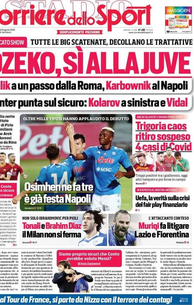 Sulla prima pagina del Corriere dello Sport di sabato 29 agosto c'è spazio anche per il mercato dell'Inter: "L'Inter punta sul sicuro: Kolarov a sinistra e Vidal". C'è poi anche un interrogativo che si pone il direttore Ivan Zazzaroni: "Siamo proprio sicuri che Conte avrebbe voluto Messi?".