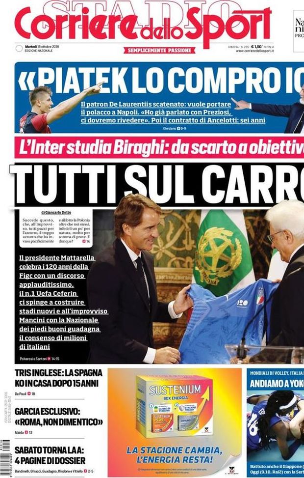 La prima pagina del Corriere dello Sport in edicola martedì 16 ottobre 2018 parla di Inter: "L'Inter studia Biraghi: da scarto ad obiettivo". Chiaro il riferimento all'ex terzino dell'Inter Primavera - ora alla Fiorentina - nonché match-winner della sfida tra Italia e Polonia. Proprio la Nazionale di Mancini è in copertina mentre in taglio alto spazio all'intervista di De Laurentiis che punta a prendere Piatek.