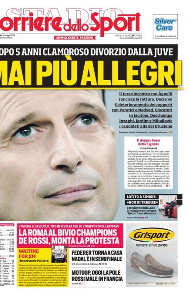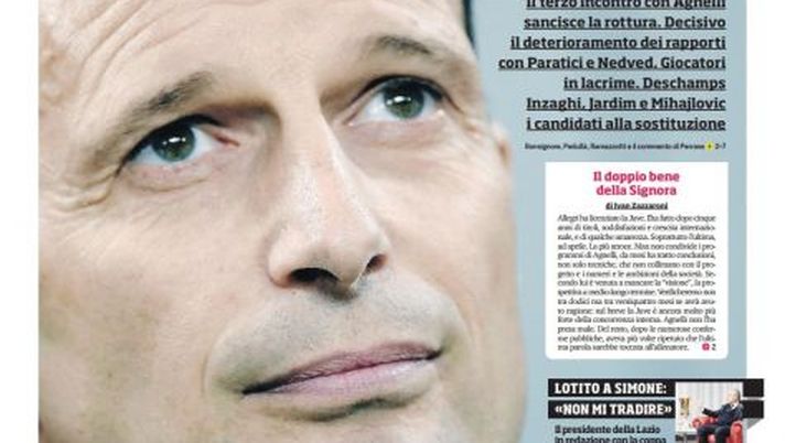 Prima pagina del Corriere dello Sport dedicata alla rottura tra Massimiliano Allegri e la Juventus, con l'allenatore che lascerà il club al termine della stagione. "Mai più Allegri: dopo 5 anni clamoroso divorzio dalla Juve. Il terzo incontro con Agnelli sancisce la rottura. Decisivo il deterioramento dei rapporti con Paratici e Nedved. Giocatori in lacrime. Deschamps, Inzaghi, Jardim e Mihajlovic i candidati alla sostituzione".