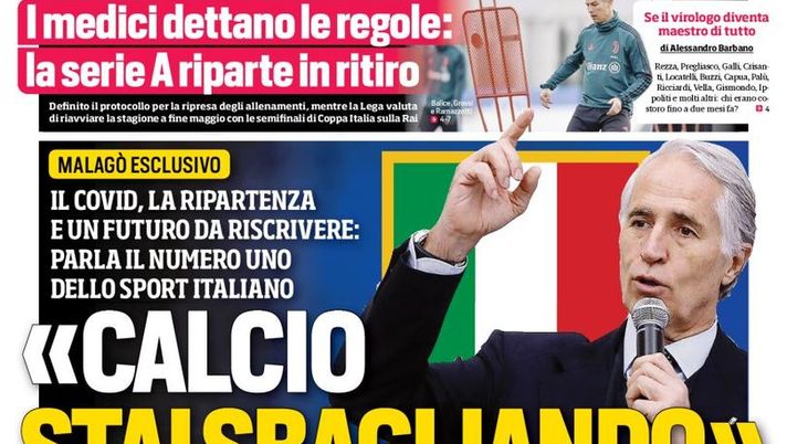 Sulla prima pagina del Corriere dello Sport parla il numero uno del Coni sulle discussioni per la ripresa del campionato di Serie A. Malagò: "Calcio stai sbagliando. Si procede a vista e in ordine sparso".