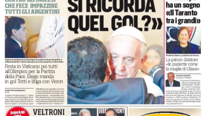 Sulla prima pagina del Corriere dello Sport di domani il titolo principale se lo sono presi Maradona e Papa Francesco: “Santità, si ricorda quel gol? Maradona disegna a Papa Francesco la prodezza contro gli inglesi che fece impazzire tutti...