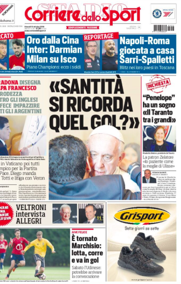 Sulla prima pagina del Corriere dello Sport di domani il titolo principale se lo sono presi Maradona e Papa Francesco: "Santità, si ricorda quel gol? Maradona disegna a Papa Francesco la prodezza contro gli inglesi che fece impazzire tutti gli argentini".