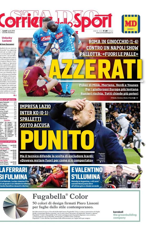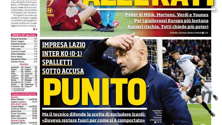 Sulla prima pagina del Corriere dello Sport si parla della sconfitta dell'Inter contro la Lazio: "Punito, Spalletti sotto accusa. Il tecnico difende la scelta di escludere Icardi: "Doveva stare fuori per come si è comportato".