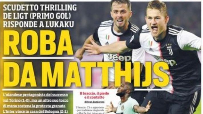 Il Corriere dello Sport in edicola oggi parla della lotta scudetto tra Inter e Juventus. Questo il titolo dedicato alle vittorie dei due club: "Roba De Matthijs. Scudetto Thrilling. De Ligt (primo gol) risponde a Lukaku".