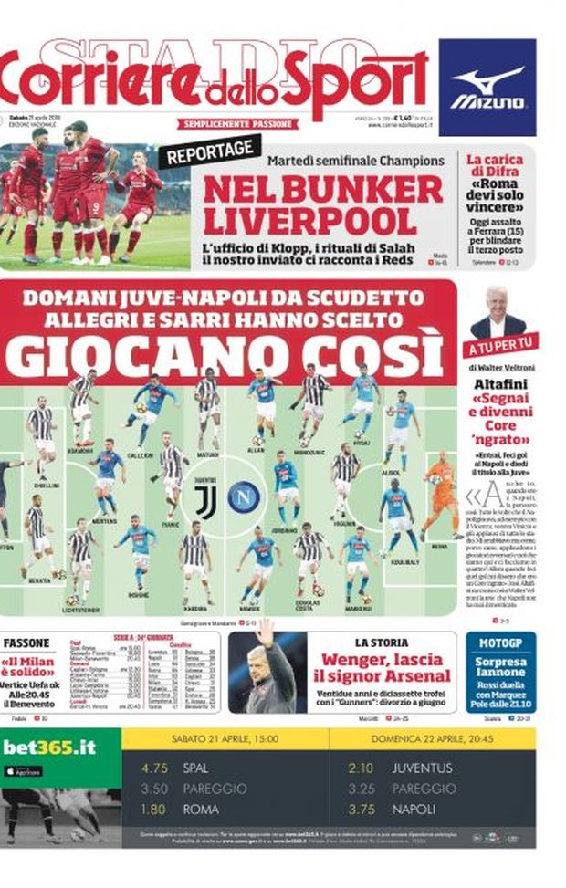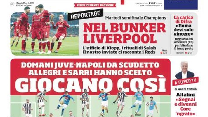 La prima pagina del Corriere dello Sport dedica la copertina a Juventus-Napoli: "Giocano così. Domani Juve-Napoli da scudetto. Allegri e Sarri hanno scelto". Nel taglio alto, invece, spazio alla Roma: "La carica di Difra: 'Roma, devi solo vincere'. Oggi assalto a Ferrara (15) per blindare il terzo posto". In taglio basso focus sul Milan e sulle parole di Fassone: "'Il Milan è solido'. Vertice UEFA ok, alle 20.45 il Benevento".