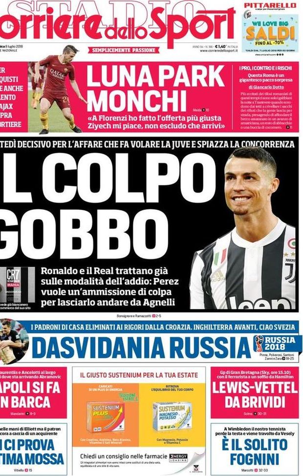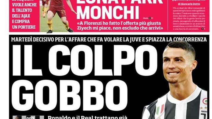Il Corriere dello Sport in edicola oggi dedica la prima pagina a Cristiano Ronaldo: "Il colpo gobbo. Martedì decisivo per l'affare che fa volare la Juve e spiazza la concorrenza. Perez vuole un'ammissione di colpa per farlo andare da Agnelli". In taglio alto le parole del direttore sportivo della Roma: "Il Luna Park di Monchi che dice di aver fatto l'offerta più giusta a Florenzi". Sul Milan: "Li ci prova, ultima mossa. Milan nelle mani di Elliott ma il patron va ancora a caccia di un acquirente".