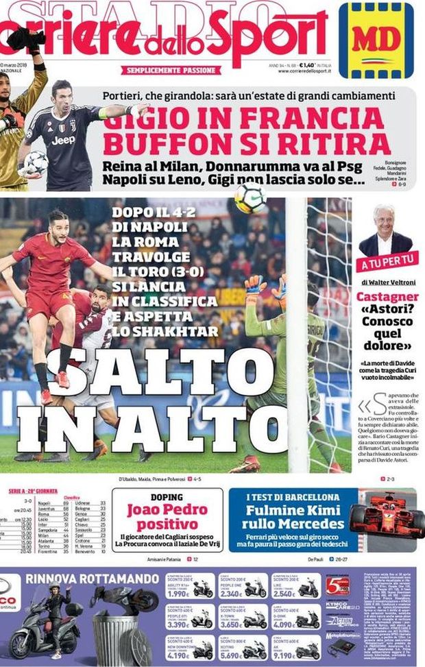 La prima pagina del Corriere dello Sport in edicola sabato 10 marzo 2018 parla di Roma: "Dopo il 4-2 di Napoli, la Roma travolge il Toro (3-0), si lancia in classifica e aspetta lo Shakhtar". In taglio alto spazio ai portieri: "Che girandola, sarà un'estate di grandi cambiamenti. Gigio in Francia, Buffon si ritira. Reina al Milan, Donnarumma al PSG. Napoli su Leno, Gigi non lascia solo se...". In taglio basso, invece, ecco la doppia vicenda doping: "Joao Pedro positivo. Il giocatore del Cagliari sospeso. La Procura convoca il laziale de Vrij".
