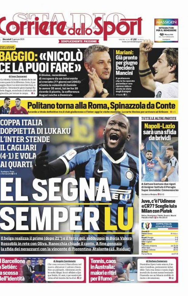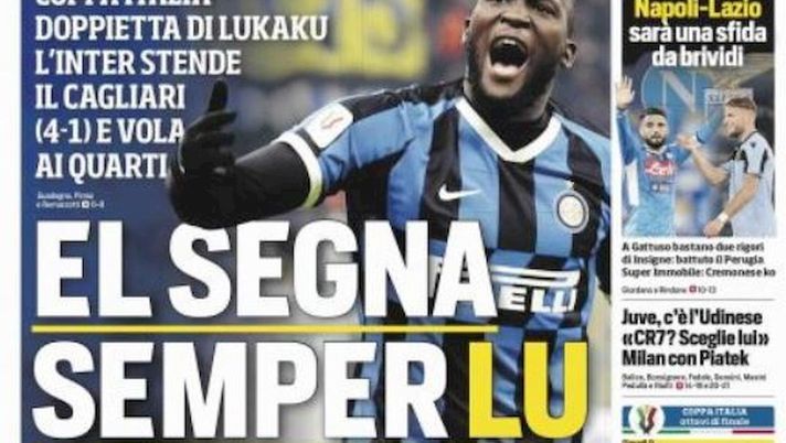 Il Corriere dello Sport parla in prima pagina della vittoria dei nerazzurri contro il Cagliari e il protagonista della 'copertina' è Lukaku e il titolo è una tipica espressione milanese. "El segna semper Lu. Coppa Italia, doppietta di Lukaku l'Inter stende i rossoblù e vola ai quarti. Il belga realizza il primo gol dopo 21 secondi e il terzo gol. Raddoppio di Borja Valero. I sardi in rete con Oliva. Ranocchia chiude il conto. A fine gennaio la sfida con la vincente di Fiorentina-Atalanta". E per quanto riguarda il mercato: "Politano torna alla Roma, Spinazzola da Conte. Accordo a titolo definitivo tra il club giallorosso e l'Inter. Oggi le visite mediche. La carta Vecino per arrivare ad Eriksen".