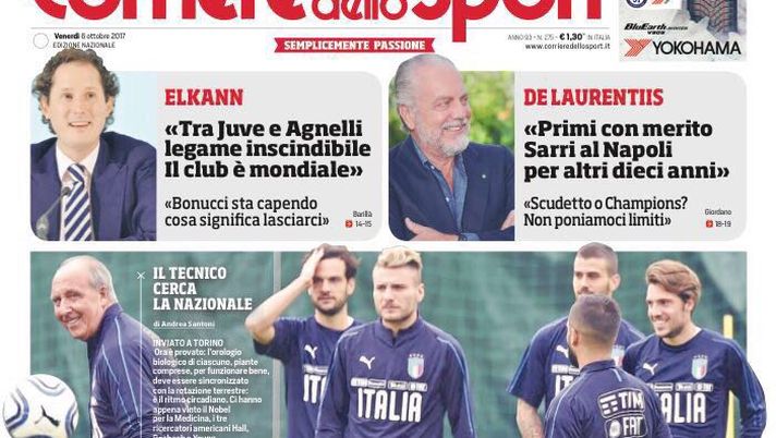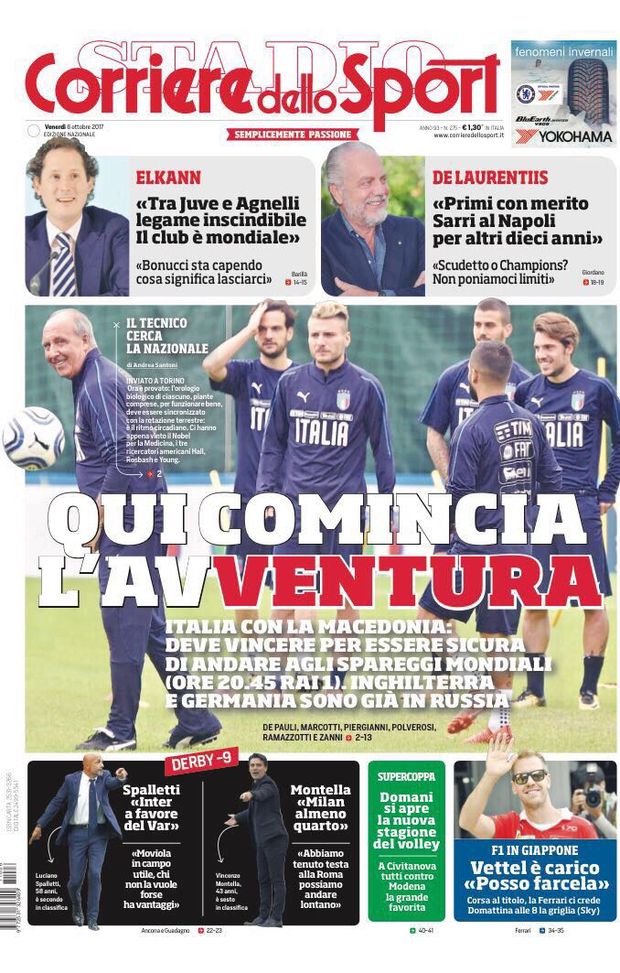 Sulla prima pagina del Corriere dello Sportvengono riportate le parole di Spalletti pronunciate all'evento che si è tenuto allo Studio Volvo di Milano: "Inter a favore del VAR, moviola in campo utile, chi non la vuole forse ha vantaggio". Meno nove giorni dal derby e quindi ci sono anche le parole di Montella, allenatore del Milan: "Noi almeno quarti. Abbiamo tenuto testa alla Roma e possiamo andare lontano". In primo piano la Nazionale Italiana: "Qui comincia l'avVentura". E le parole di Elkann: "Bonucci sta capendo cosa significa lasciarci".