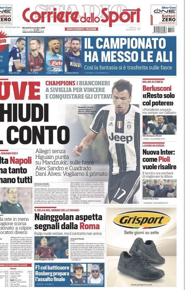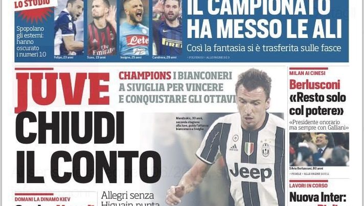 Il Corriere dello Sport in edicola oggi si sofferma su un ruolo in particolare nel taglio alto della prima pagina: "Spopolano gli esterni: hanno oscurato i numeri 10. Il campionato ha messo le alti. Così la fa fantasia si è trasferita sulle fasce". Berlusconi intanto ha detto ai cinesi che resta solo con il potere, farà il presidente onorario solo se resta anche Galliani in società. Paginone centrale per la Juventus: "Chiudi il conto. I bianconeri a Siviglia per vincere e conquistare gli ottavi". Spazio anche per l'Inter: "Ecco come Pioli vuole risalire. Il tecnico ora cercherà di migliorare la difesa". Calciomercato, "Nainggolan aspetta segnali dalla Roma, ma il rinnovo non arriva. E' nel mirino delle grandi".