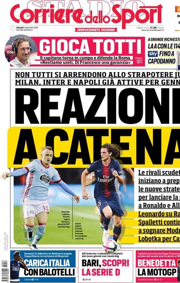 Il Corriere dello Sport in edicola oggi parla di mercato: "Reazione a catena. Non tutti si arrendono allo strapotere Juventus. Milan, Inter e Napoli già attive per gennaio. Le rivali scudetto iniziano a preparare le nuove strategie per lanciare la sfida a Ronaldo e Allegri. Leonardo su Rabiot. Spalletti continua a sognare Modric. Lobotka per Carletto".