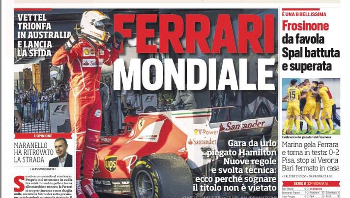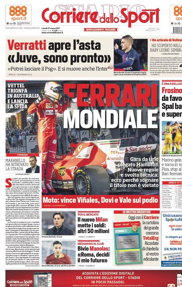 Anche la prima pagina del Corriere dello Sport di lunedì 27 marzo celebra la vittoria della Ferrari in Australia. In taglio alto le parole di Marco Verratti: "Potrei lasciare il PSG". Juventus e Inter alla finestra. Spazio anche per un altro obiettivo dei nerazzurri, Kostas Manolas, che vuole chiarezza: "Roma, decidi il mio futuro".