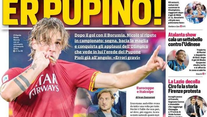 "Er Pupino!". È il titolo del Corriere dello Sport, che apre con il successo della Roma sul Milan grazie alla rete decisiva di Nicolò Zaniolo. Davanti a Francesco Totti, l'ex centrocampista dell'Inter giura fedeltà ai giallorossi baciando la maglia.