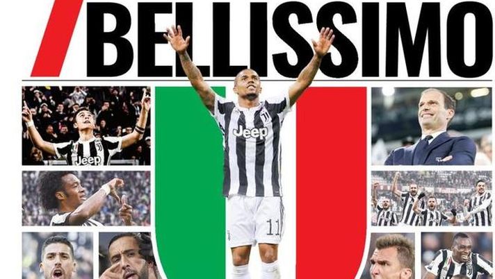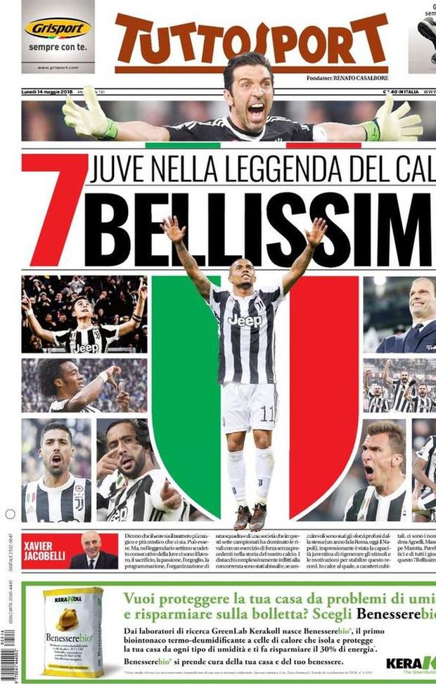 La prima pagina di Tuttosport in edicola fra poche ore ovviamente celebra la vittoria della Juventus, che con lo 0-0 di Roma contro la squadra di Eusebio Di Francesco si è portata a casa il settimo Scudetto di fila: "7 bellissimo - titola il quotidiano - Juve nella leggenda del calcio".
