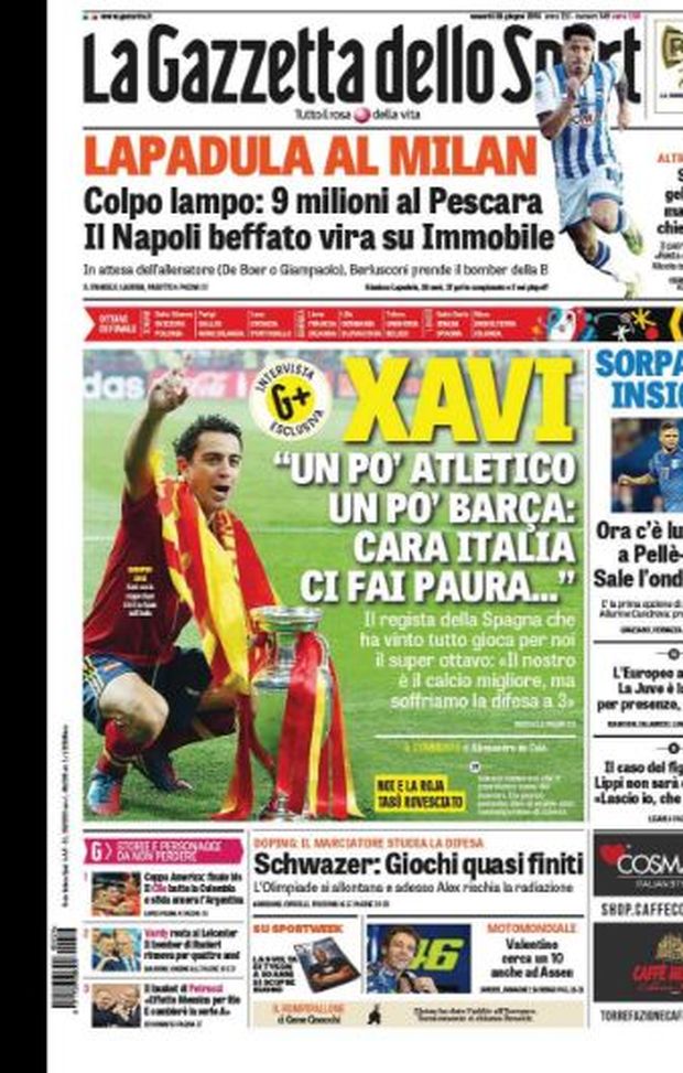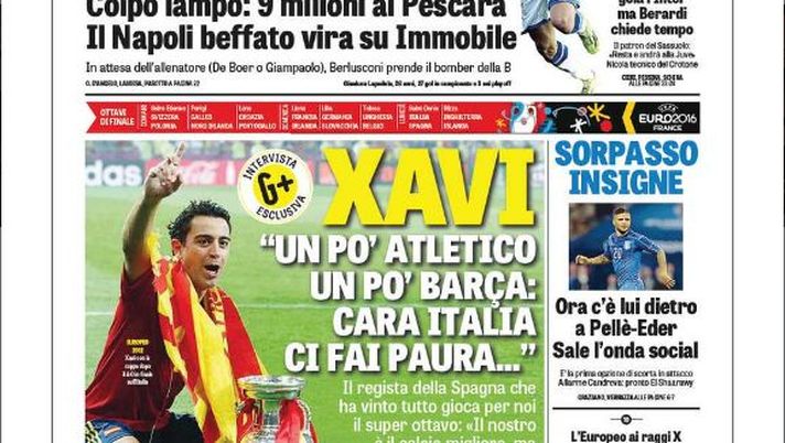 La Gazzetta dello Sport in edicola oggi torna, a proposito dell'Inter, su Berardi: "Squinzi gela l'Inter, ma il giocatore prende tempo. Il patron del club emiliano dice che resta e va alla Juve". Sempre nel taglio alto c'è la notizia di Lapadula al Milan per nove mln e del Napoli che vira su Immobile. Intervista a Xavi: "Un po' Atletico e un po' Barça: Italia ci fai paura". A proposito dell'attacco della Nazionale: "Sorpasso Insigne, ora c'è lui dietro Pellé ed Eder".