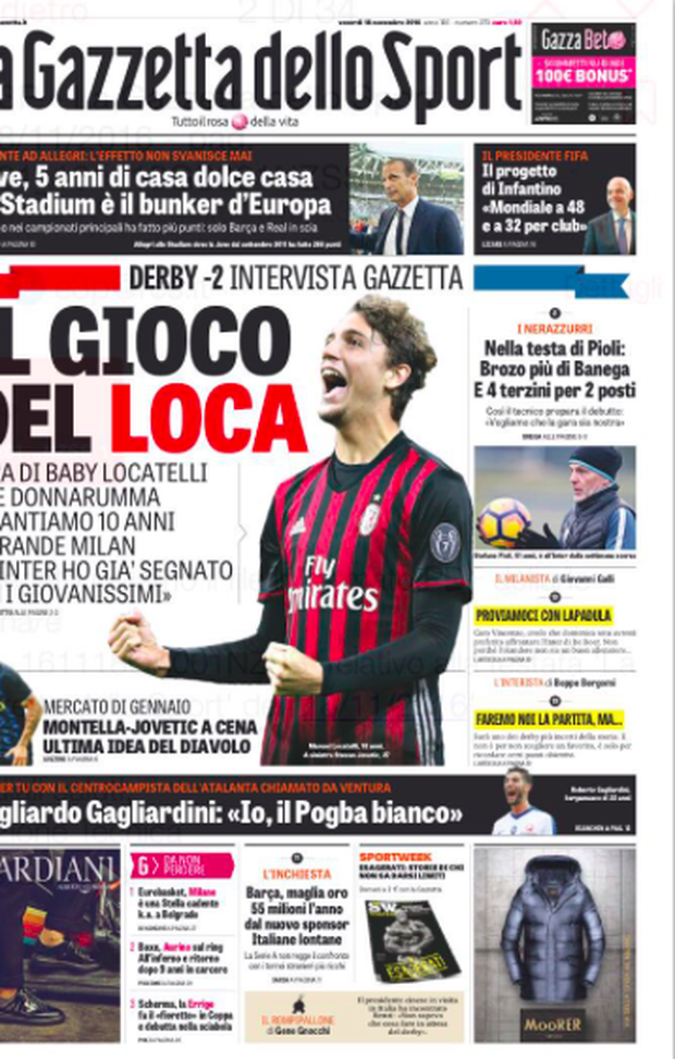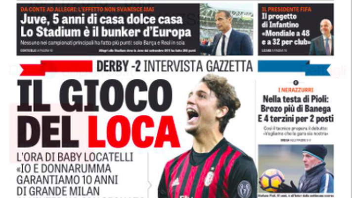 La Gazzetta dello Sport in edicola oggi parla ovviamente del derby di Milano: "-2", è il countdown rispetto al giorno nel quale si giocherà, domenica sera. La rosea ha intervista Locatelli: "Io e Donnarumma garantiamo dieci anni di grande Milan. All'Inter ho già segnato con i giovanissimi". Dall'altro lato le prove di derby di Pioli: Brozo più di Banega e quattro terzini per due posti. Spazio anche al mercato: "Montella-Jovetic a cena, ultima idea del diavolo". Nel taglio alto spazio alle idee di Infantino, presidente Uefa. E allo Juventus Stadium: "bunker d'Europa".