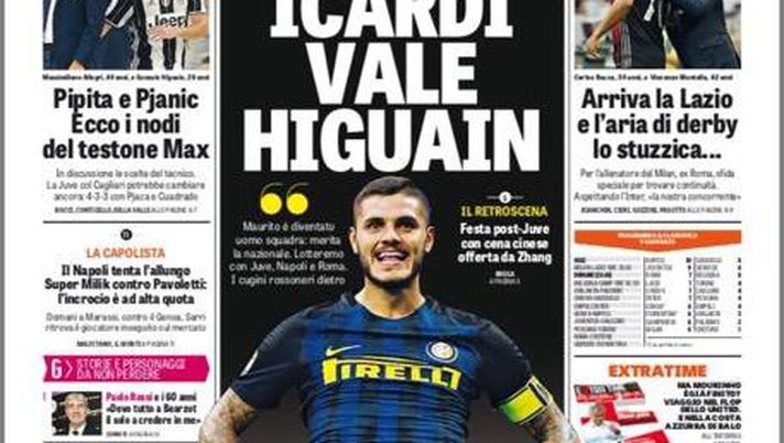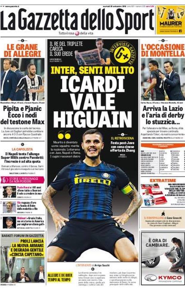 Prima pagina della Gazzetta dello Sport dedicata a Mauro Icardi: il capitano nerazzurro, protagonista assoluto nella vittoria contro la Juventus, gode della totale fiducia di un altro grande attaccante, Diego Milito. Juve, Higuain e Pjanic le due grane di mister Allegri. Montella e l'occasione Lazio: l'aria di derby lo stuzzica. Il Napoli tenta l'allungo: super Milik contro Pavoletti.