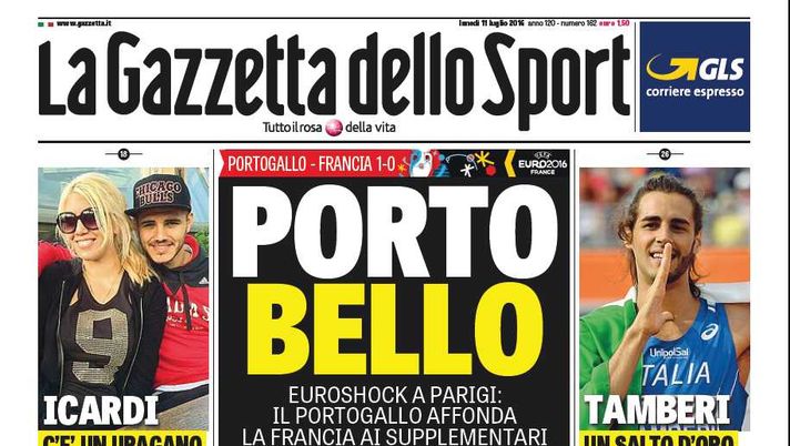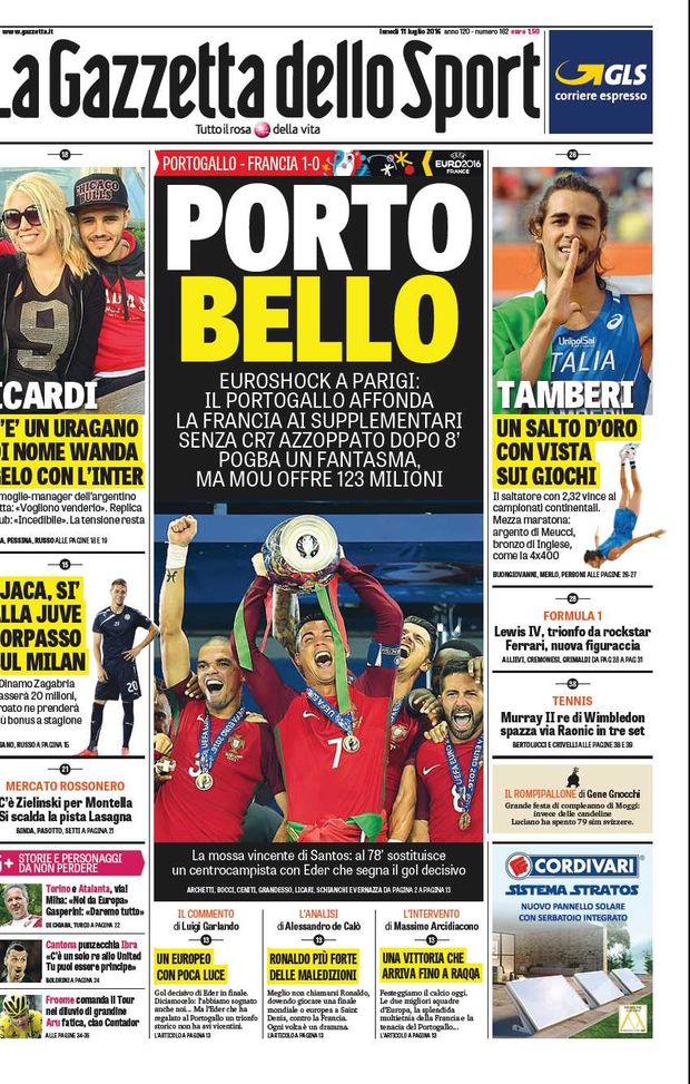 Titolone per il Portogallo campione d'Europa a Parigi. I lusitani battono la Francia e portano a casa il titolo continentale: "PortoBello. Euroshock a Parigi: il Portogallo affonda la Francia ai supplementari senza CR7 azzoppato dopo 8'. Pogba un fantasma, ma Mou offre 123 milioni".