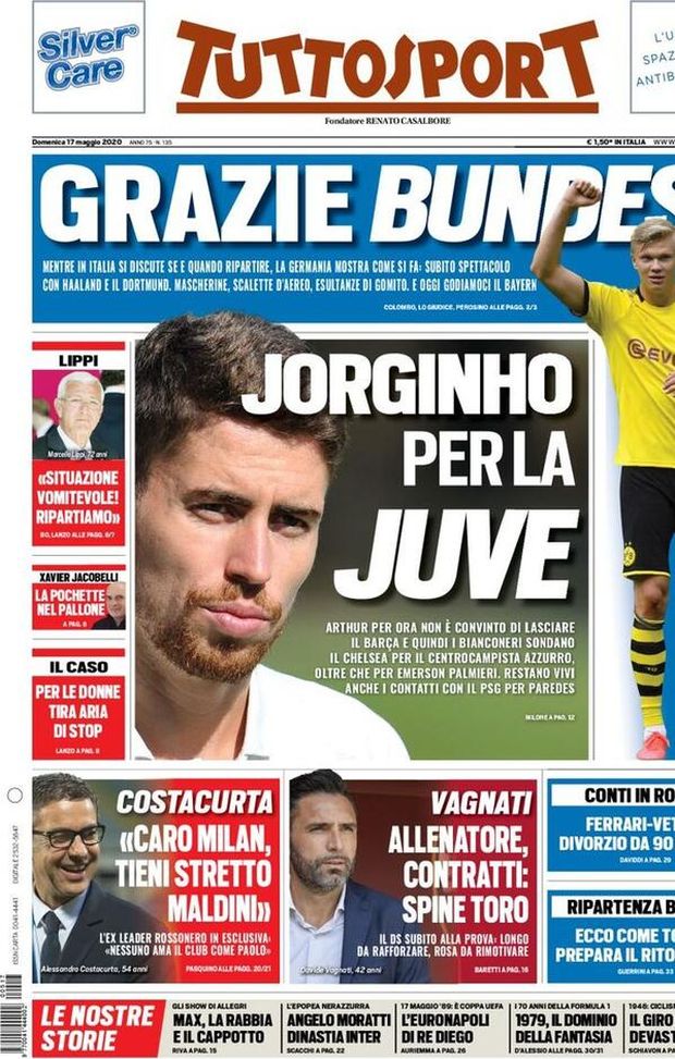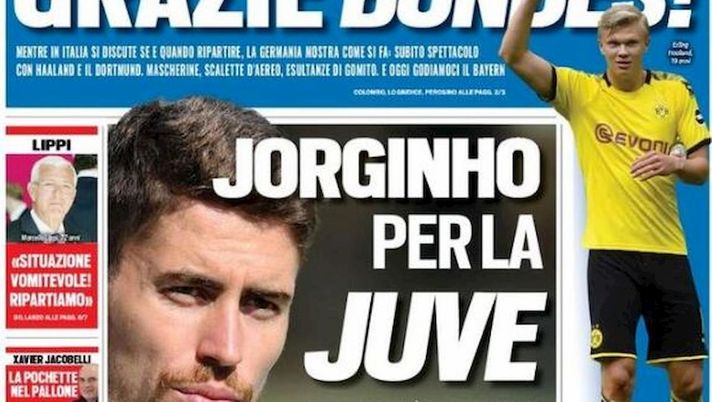 Appello di Marcello Lippi dalla prima pagina di TuttoSport: "Situazione vomitevole, ripartiamo". In prima pagina il quotidiano parla anche del mercato bianconero: "Jorginho per la Juve. Arthur per ora non è convinto di lasciare il Barça e quindi i bianconeri sondano il Chelsea per il centrocampista azzurro. Oltre che per Emerson Palmieri, restano vivi i contatti con il PSG per Paredes".