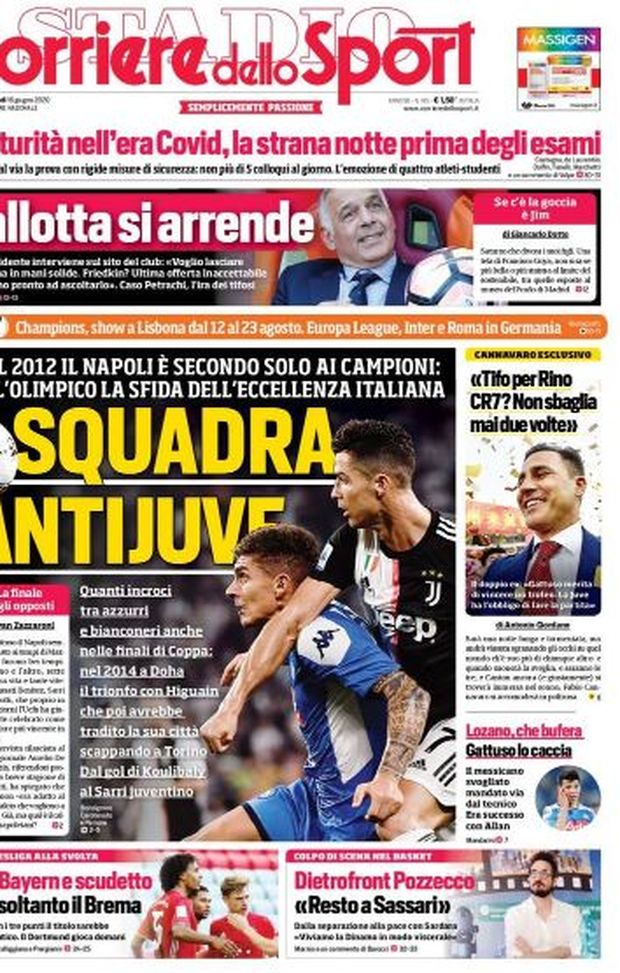 Il Corriere dello Sport apre la sua prima pagina con la finale di Coppa Italia: "Napoli squadra anti-Juve" è il titolo in prima pagina scelto dal quotidiano. "Dal 2012 il club di De Laurentiis è secondo solo ai campioni. All'Olimpico la sfida dell'eccellenza italiana". Spazio anche all'Europa League: "Inter e Roma in Germania". L'UEFA deve ratificare la decisione sulle gare che si giocheranno ad agosto in gara secca.