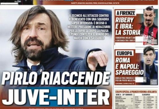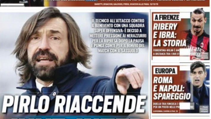 La prima pagina di Tuttosport in edicola nelle prossime ore torna sulle parole di Andrea Pirlo, allenatore della Juventus, alla vigilia della partita contro il Benevento. "Pirlo riaccende Juve-Inter. Il tecnico all'attacco con una squadra super offensiva: è deciso a mettere pressione ai nerazzurri per la ripresa dopo la pausa. E punge Conte per il rinvio del match con il Sassuolo".