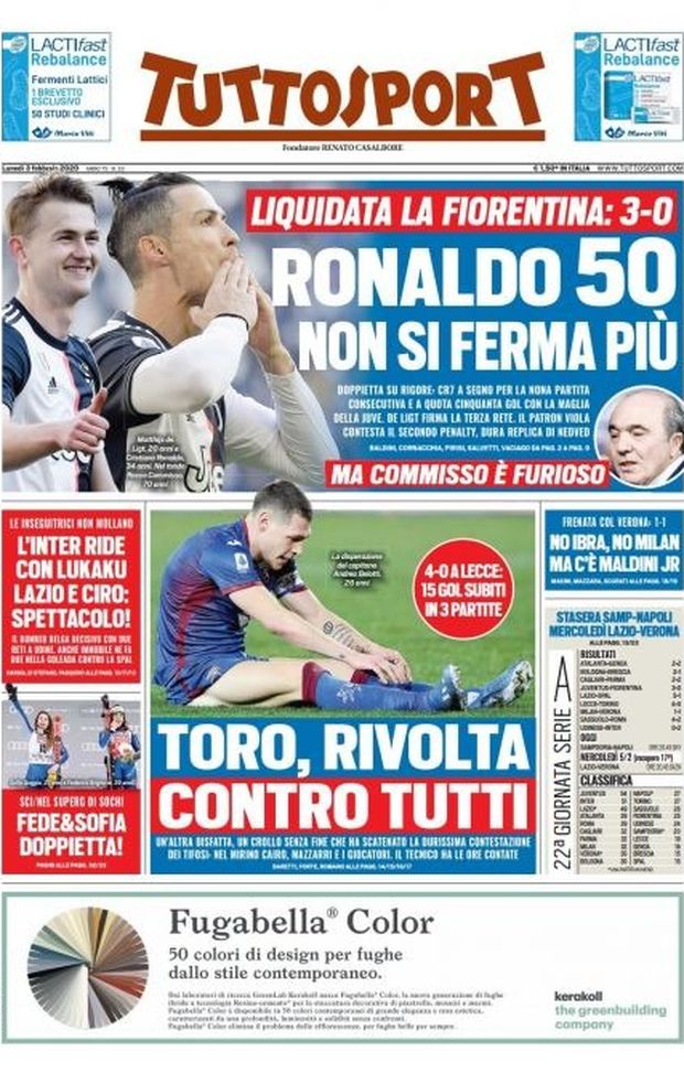 Come ha riassunto TuttoSport l'ultima giornata di campionato? Il titolo principale è dedicato come sempre alla Juventus e a Ronaldo: "50, non si ferma più. Doppietta su rigore, a segno per la nona partita consecutiva. E' a quota cinquanta gol con la maglia della Juventus. Ma Commisso è furioso". Sulla vittoria dei nerazzurri alla Dacia Arena si legge: "L'Inter ride con Lukaku. Lazio e Ciro spettacolo. Le inseguitrici non mollano".