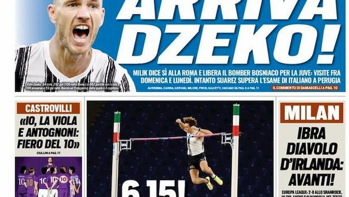 "Arriva Dzeko. Milik dice sì alla Roma e libera il bomber bosniaco per la Juve: visite fra domenica e lunedì. Intanto Suarez supera l'esame di italiano a Perugia". Così la prima pagina di Tuttosport sul valzer degli attaccanti in Serie A.