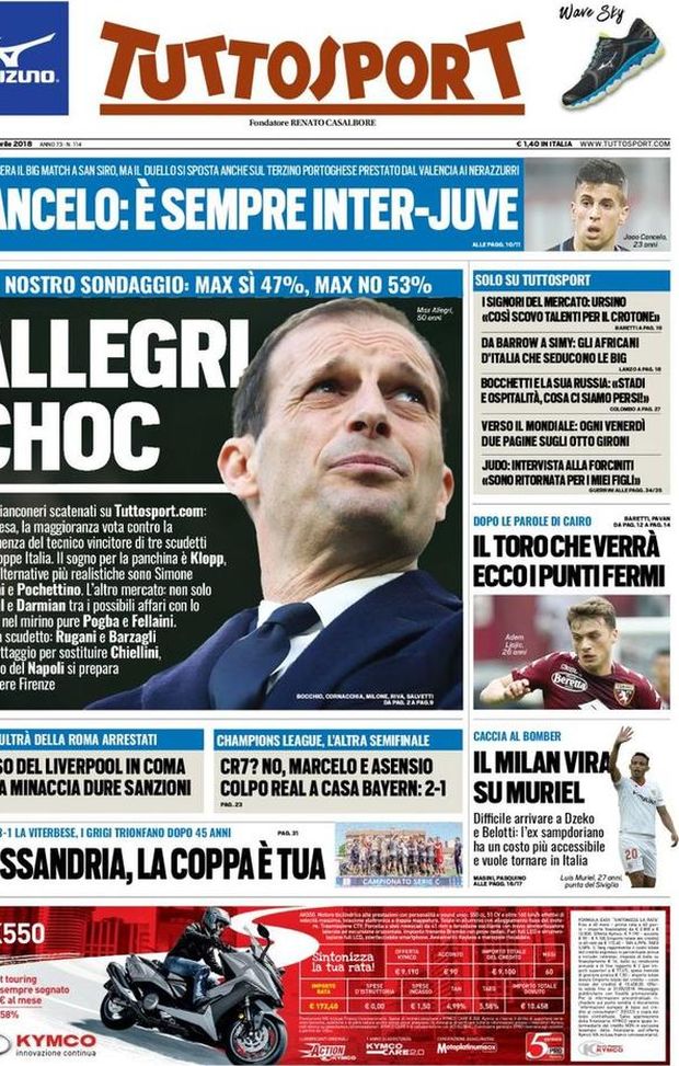 Sulla prima pagina di Tuttosport si parla del possibile duello di mercato tra Inter e Juve per Cancelo: "Sabato sera il big match a San Siro, ma il duello si sposta anche sul terzino portoghese prestato dal Valencia ai nerazzurri".