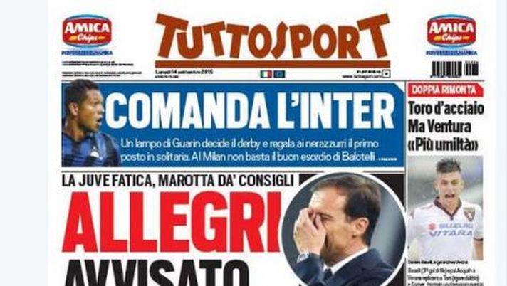 Marotta dà la scossa alla Juventus e TuttoSport ovviamente gli dedica la prima pagina: "Nessun alibi, alla Juve bisogna partecipare per vincere tutto", le parole del dirigente e il giornale scrive: "Allegri avvisato, la Juve fatica Marotta dà consigli". Spazio anche ai nerazzurri che hanno vinto il derby: "Comanda l'Inter. Un lampo di Guarin decide il derby e regala ai nerazzurri il primo posto in solitaria. Al Milan non basta il buon esordio di Balotelli".