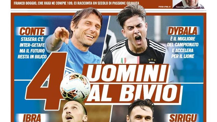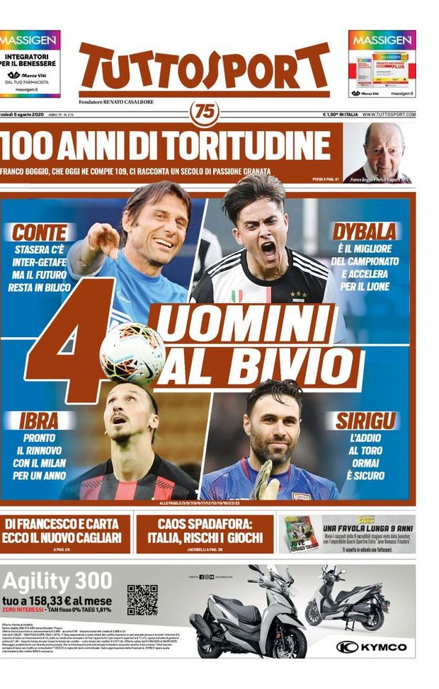 "Conte, stasera c'è il Getafe: ma il futuro resta in bilico". Così Tuttosport, nella sua prima pagina di mercoledì 5 agosto, in merito al momento dell'Inter, impegnata stasera in Europa League contro il Getafe.