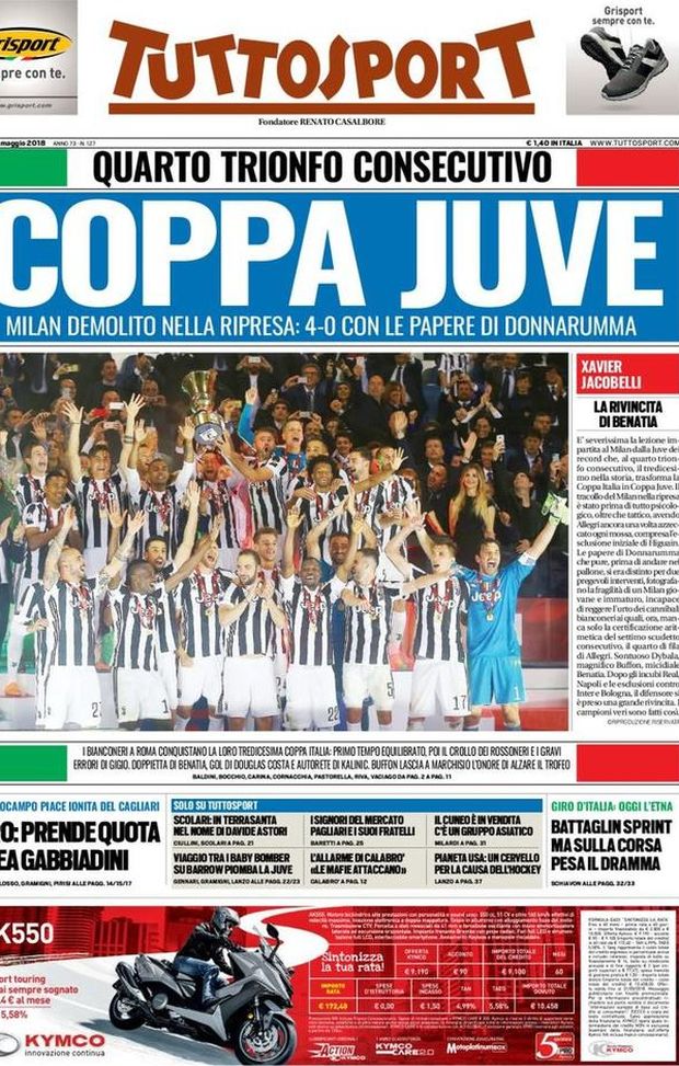 "Coppa Juve, Milan demolito nella ripresa: 4-0 con le papere di Donnarumma". E' questo il titolo della prima pagina di Tuttosport in edicola giovedì 10 maggio 2018. Spazio anche al mercato del Torino ("Prende quota l'idea Gabbiadini") e dei baby bomber ("Su Barrow piomba la Juve").