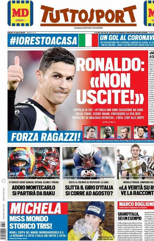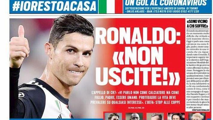 Si parla ovviamente dell'emergenza coronavirus che sta colpendo l'Italia sulla prima pagina di Tuttosport in edicola nelle prossime ore. Il quotidiano pone l'attenzione sulle parole di Cristiano Ronaldo direttamente dal Portogallo: "Ronaldo: 'Non uscite!'. L'appello di CR7: 'Vi parlo non come calciatore, ma come figlio, padre, essere umano. Proteggere la vita deve prevalere su qualsiasi interesse'. L'UEFA: stop alle coppe".