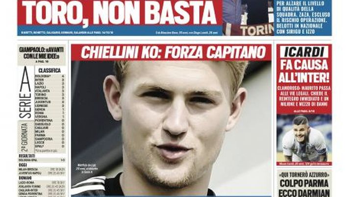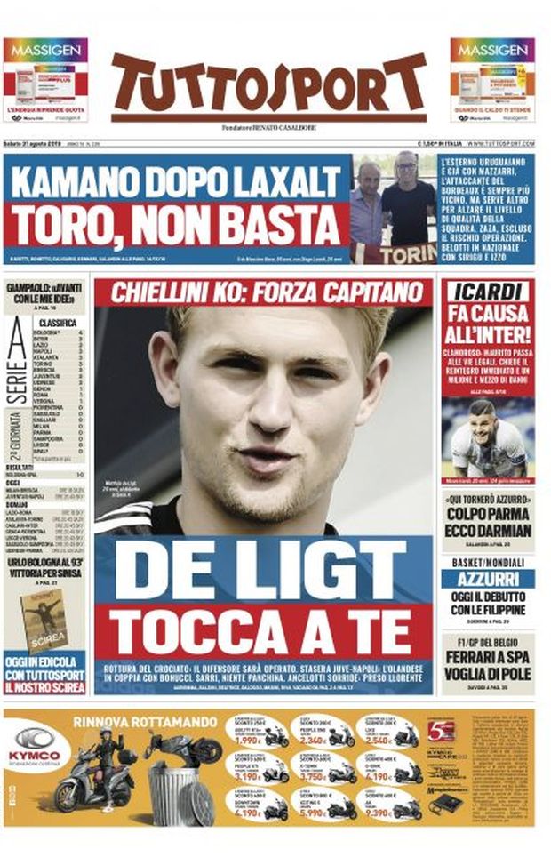 Tuttosport dedica il titolo principale della sua prima pagine del 31 agosto 2019 a Matthijs De Ligt, ora chiamato in causa dopo il grave infortunio occorso a Giorgio Chiellini .