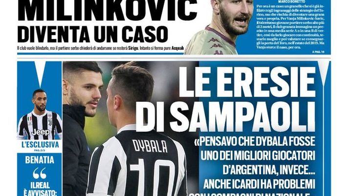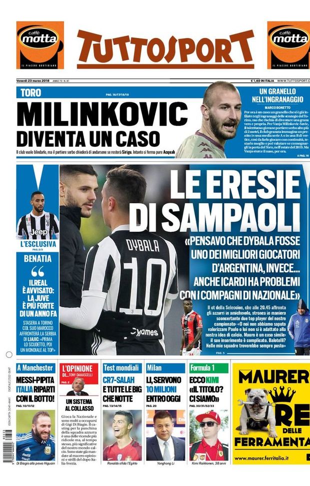 Mauro Icardi e Paulo Dybala salteranno il Mondiale. Le parole di Jorge Sampaoli non sono state rassicuranti e così sono finite sulla prima pagina di TuttoSport e catalogate sotto la parola eresia: "Pensavo che Dybala fosse uno dei migliori giocatori d'Argentina e invece... Anche Icardi ha problemi con i compagni di Nazionale". E' la sintesi delle parole dell'allenatore e il giornale sottolinea: "Stronca in maniera sconcertante due top player del nostro campionato". "Messi-Pipita, l'Italia riparte con il botto", è il titolo dedicato all'amichevole della Nazionale italiana.