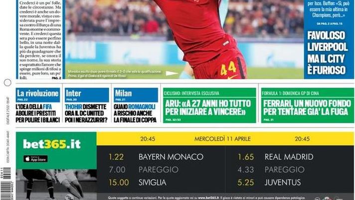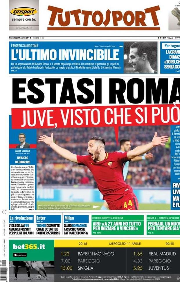 Come prevedibile, l'impresa della Roma che ha eliminato il Barcellona in Champions League è un modo di dare la carica alla Juventus che stasera dovrà affrontare il Real Madrid: "Estasi Roma. Juve, visto che si può?". Questo il titolo che TuttoSport sceglie per parlare delle partite di coppe. E in fondo alla pagina si parla anche del presidente nerazzurro: "Thohir dismette. Ora il Dc United, poi l'Inter?". Viene anche rilanciata una notizia di giornata: "La Fifa vuole abolire i prestiti per pulire i bilanci".