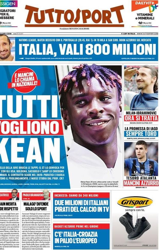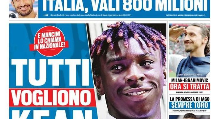 TuttoSport parla di Kean in prima pagina: "Tutti lo vogliono e Mancini lo chiama in Nazionale", è il titolo principale. Nel taglio alto si parla dell'Italia: "Vali 800mln. Nations League, match decisivo con il Portogallo. In 70mila a San Siro, boom azzurro sul mercato". E a proposito di quello del Milan si legge: "Ibrahimovic-Milan, ora si tratta.