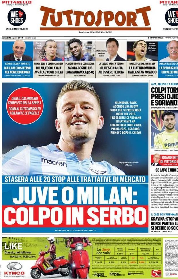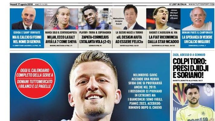 E' diventato ufficiale oggi il rinvio delle partite della prima giornata di Serie A di Sampdoria e Genoa a data da destinarsi. I blucerchiati dovevano giocare a Marassi contro la Fiorentina, mentre i rossoblù a San Siro contro il Milan, ma entrambi i match non verranno disputati per la tragedia che ha colpito il capoluogo ligure dopo il crollo del ponte Morandi, che ha causato 39 morti e decine di feriti. Tuttosport scrive: "Genoa e Samp rinviate, ma il calcio si fermi nel nome di Genova".