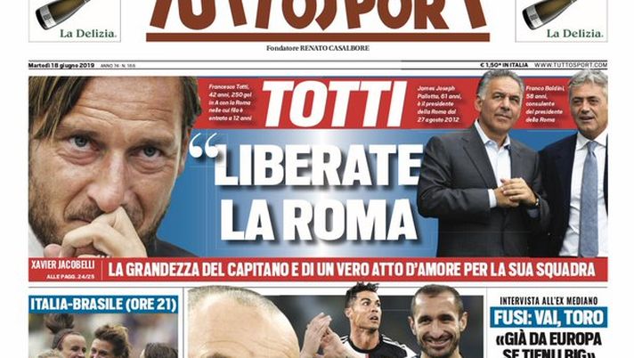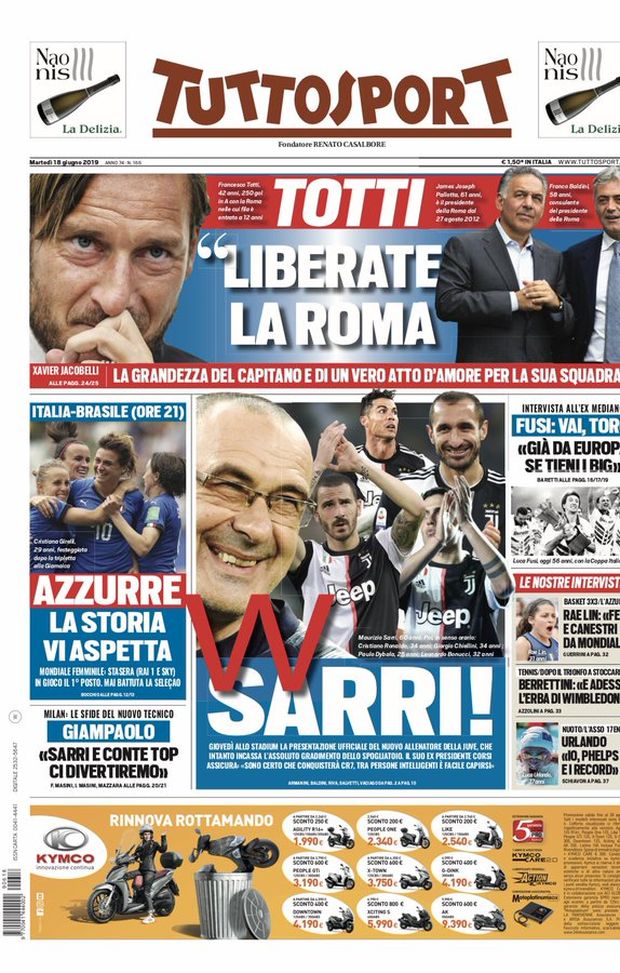 La prima pagina di Tuttosport in edicola martedì 18 giugno 2019 non parla di Inter. Copertina dedicata al nuovo tecnico della Juventus: "W Sarri". Di spalla, invece, spazio all'Italia femminile e all'intervista a Fusi, ex Torino. C'è anche l'intervista a Giampaolo: "Sarri e Conte top, ci divertiremo". In taglio alto, invece, approfondimento sul caso Totti-Roma.