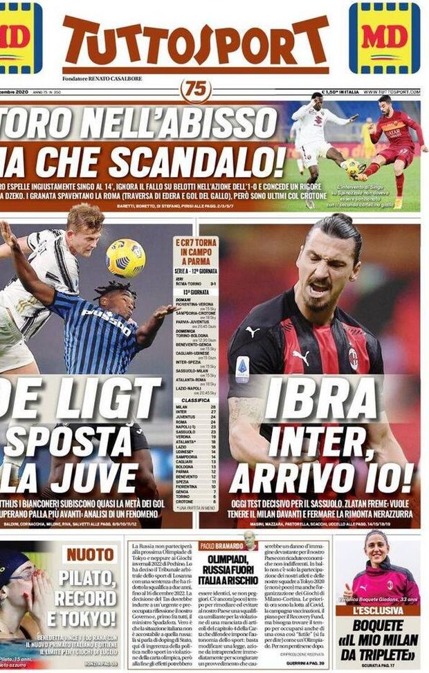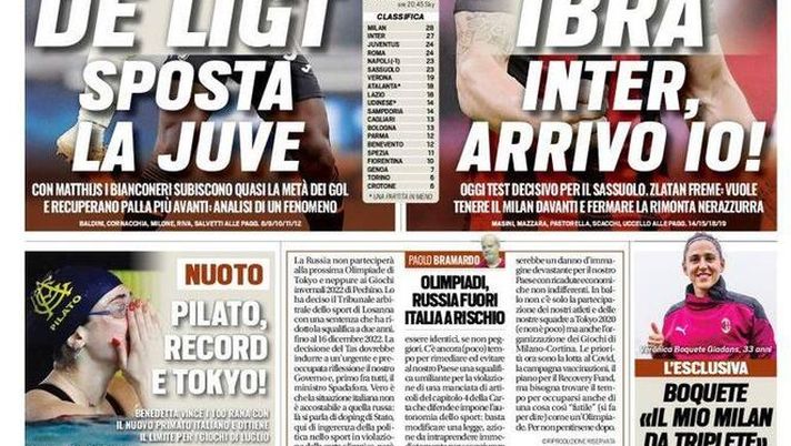 Spazio al verdetto di Roma-Torino e all'ormai imminente ritorno in campo di Zlatan Ibrahimovic nel Milan, sulla prima pagina di TuttoSport in edicola domani mattina. "Inter, arrivo io!", il messaggio che idealmente lo svedese ha rivolto ai nerazzurri che inseguono i rossoneri in classifica. "Oggi test decisivo per il Sassuolo. Zlatan freme: vuole tenere il Milan davanti e fermare la rimonta nerazzurra", si legge.